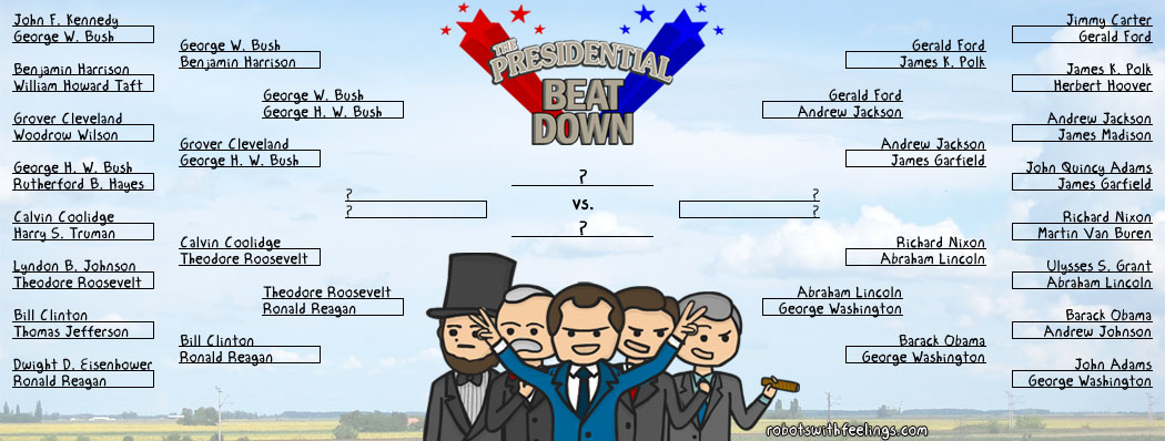 And with that, we now have our final four! George H.W. Bush, Theodore Roosevelt, Andrew Jackson and George Washington. Next week begins the semi-finals! Tune in, non-sports fans!